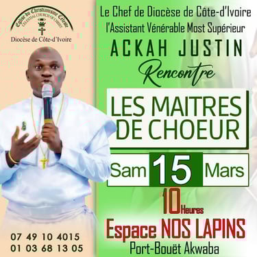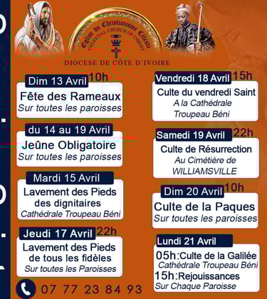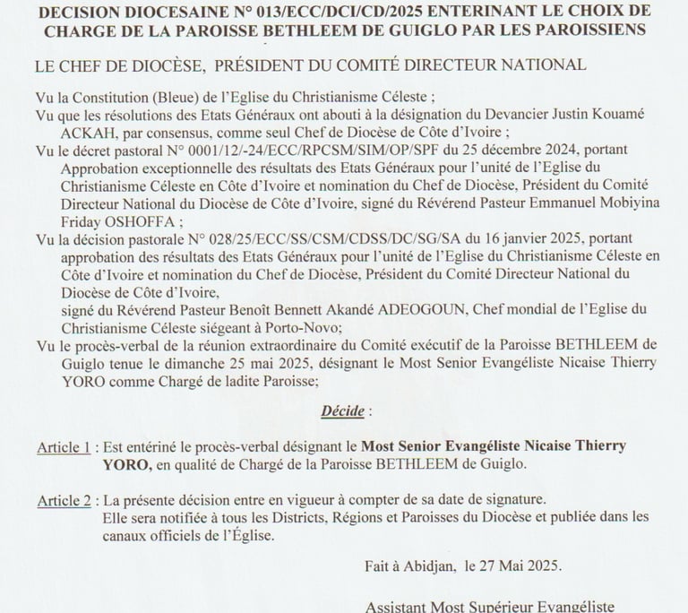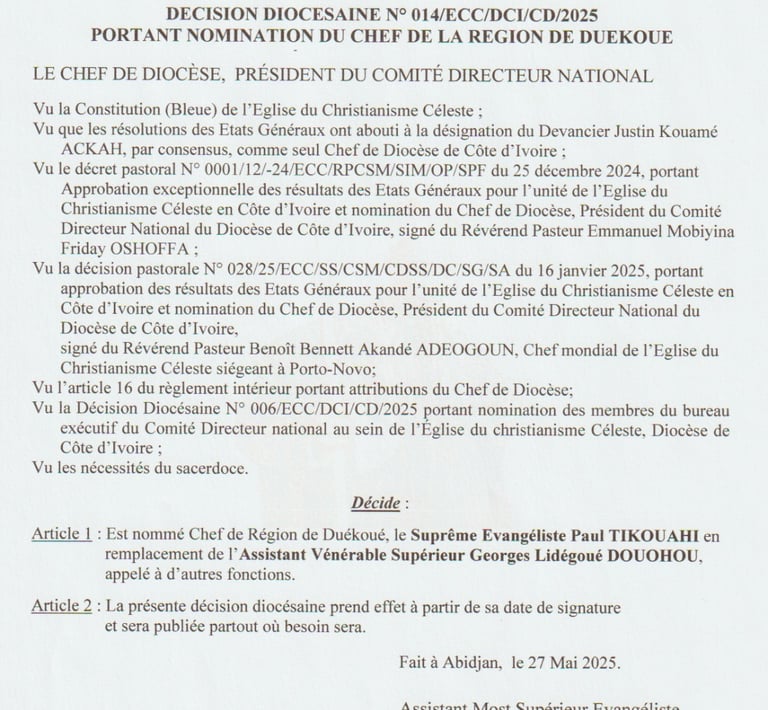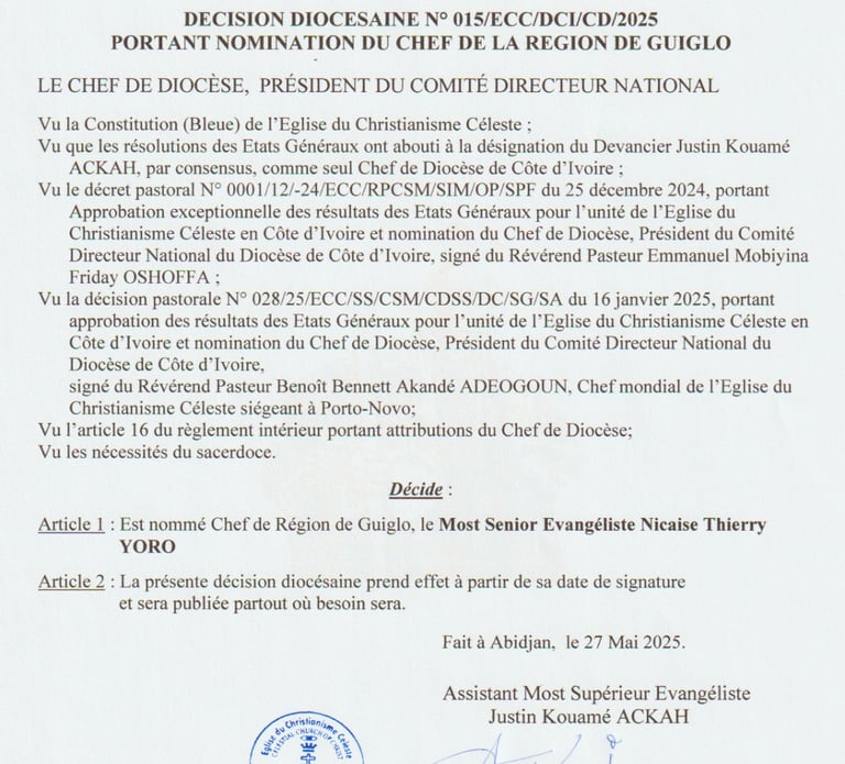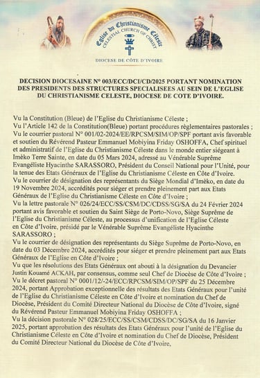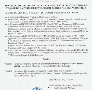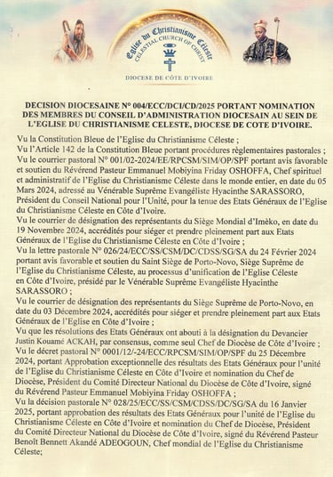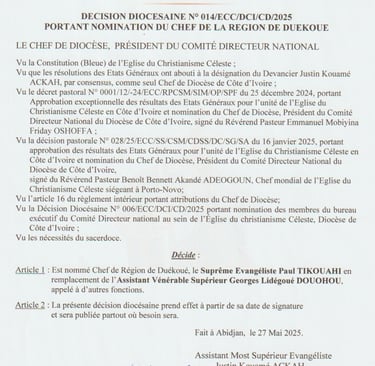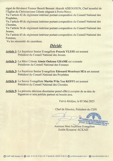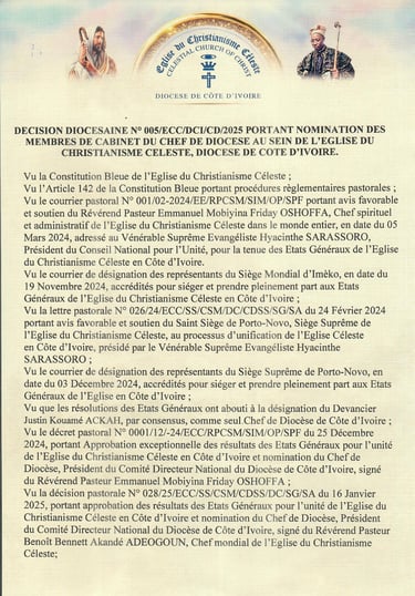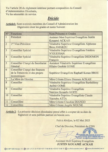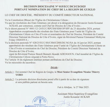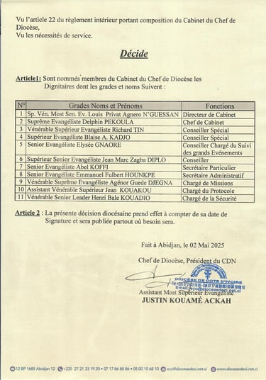 Le Chef de Diocèse, Président du Comité Directeur National a procédé à plusieurs décisions le 02 Mai 2025 portant sur la nomination des membres de son cabinet, des membres du conseil d'administration et des instances dirigeantes du diocèse de Côte d'Ivoire de l'Eglise du Christianisme Céleste.