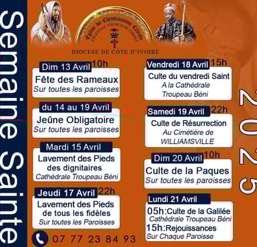 La semaine sainte commence le dimanche des Rameaux, inclut le Jeudi Saint et le Vendredi Saint où pendant cette période chaque fidèle observe un jeûne obligatoire. En 2025, cette semaine importante pour les chrétiens célestes débute le dimanche 13 avril, avec le dimanche des Rameaux. Elle s’achève le lundi 21 Avril par le culte de Galilée tôt le matin et plus tard par diverses réjouissances.