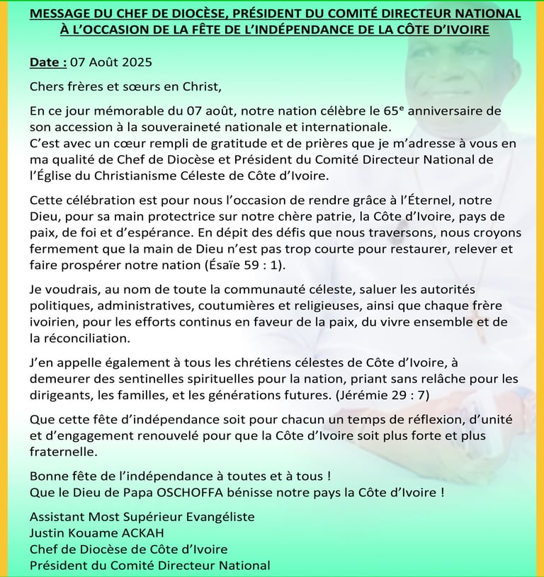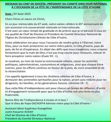 MESSAGE DU CHEF DE DIOCÈSE, PRÉSIDENT DU COMITÉ DIRECTEUR NATIONAL À L'OCCASION DE LA FÊTE DE L'INDÉPENDANCE DE LA CÔTE D'IVOIRE