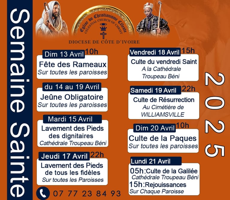 La semaine sainte commence le dimanche des Rameaux, inclut le Jeudi Saint et le Vendredi Saint où pendant cette période chaque fidèle observe un jeûne obligatoire. En 2025, cette semaine importante pour les chrétiens célestes débute le dimanche 13 avril, avec le dimanche des Rameaux. Elle s’achève le lundi 21 Avril par le culte de Galilée tôt le matin et plus tard par divers évènements
