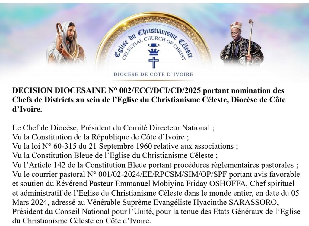 Le Chef de Diocèse, Président du Comité Directeur National a procédé à plusieurs actions le 28 Mars 2025 portant sur la nomination des Chefs de Districts et Chefs de Régions.
