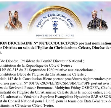 DISTRICTS ET CHEFS LIEUX DE REGIONS DE L'EGLISE DU CHRISTIANISME CELESTE DIOCESE DE CÔTE D'IVOIRE