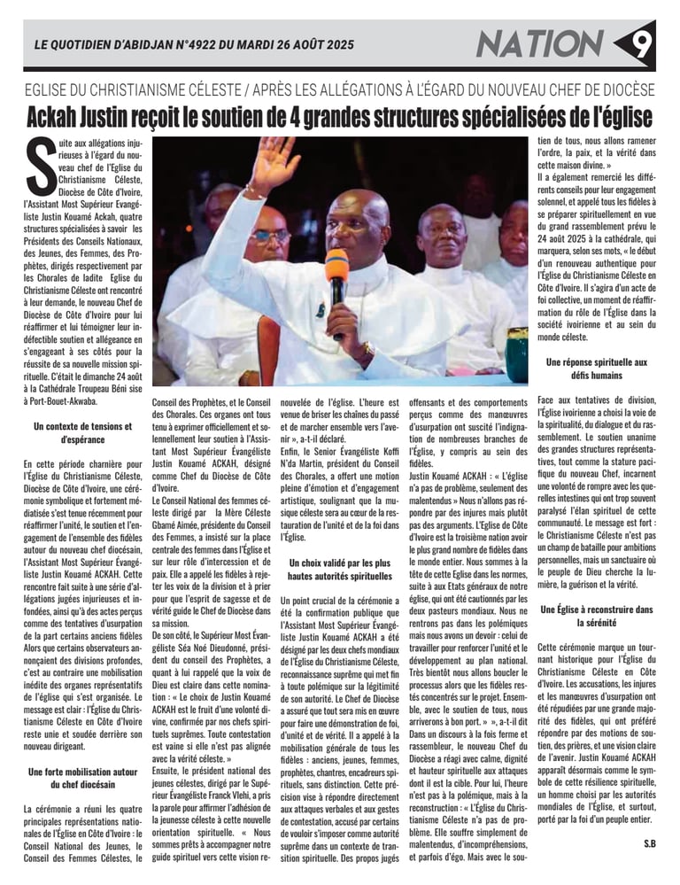 L'Eglise du Christianisme Céleste a apporté dans son entièreté, à travers ses structures, son soutien au Chef Du Diocèse l'Assistant Most Supérieur Evangéliste Justin Kouamé ACKAH.